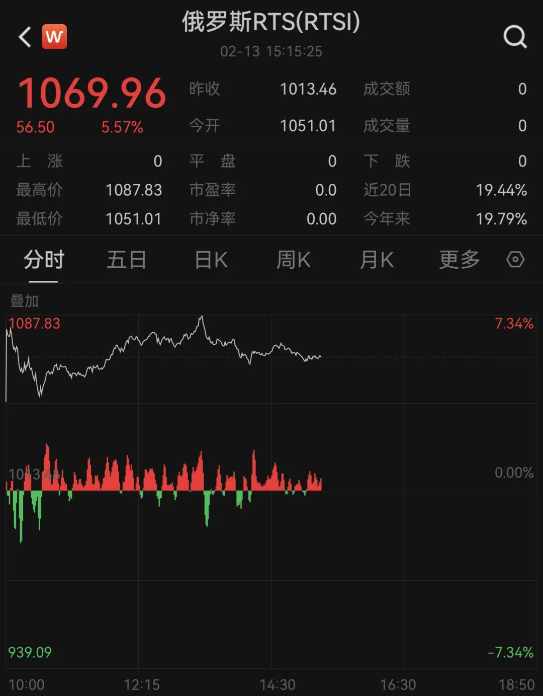 当地时间2月13日,俄罗斯股市大涨,截至发稿,俄罗斯RTS指数、俄罗斯MOEX指数均涨超5%。
