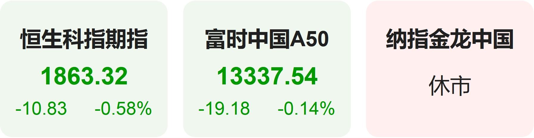 隔夜恒生科技指数期货下跌0.58%,富时中国A50指数下跌0.14%。