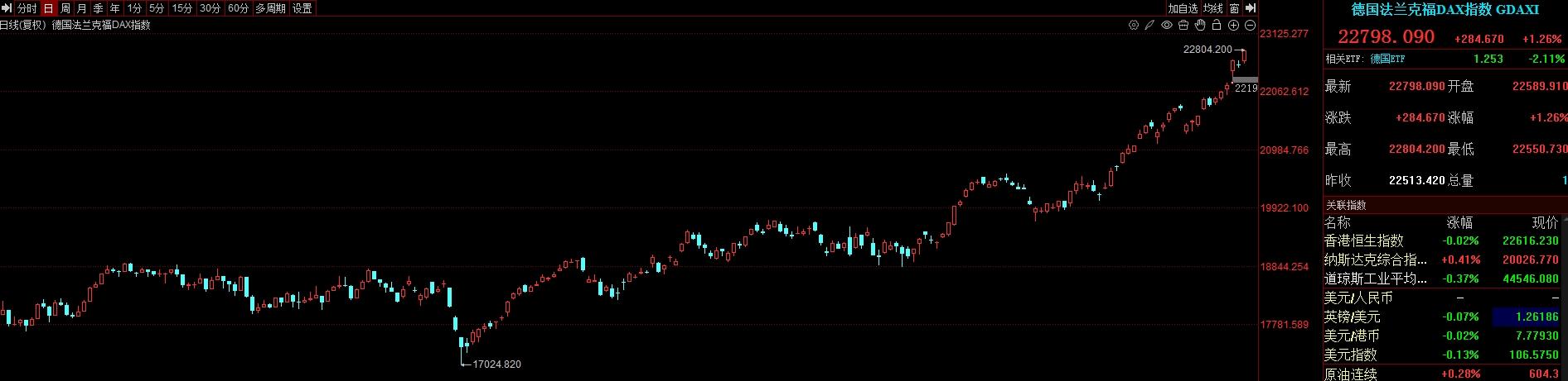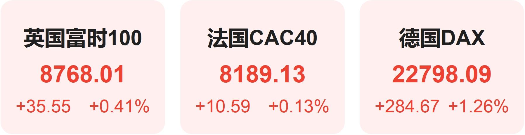 欧洲股市方面,英国富时100指数小幅上涨0.41%,报8768点。法国CAC40指数小幅上涨0.13%,报8189点。德国DAX指数上涨1.26%,报22798点。