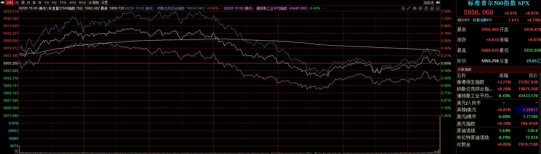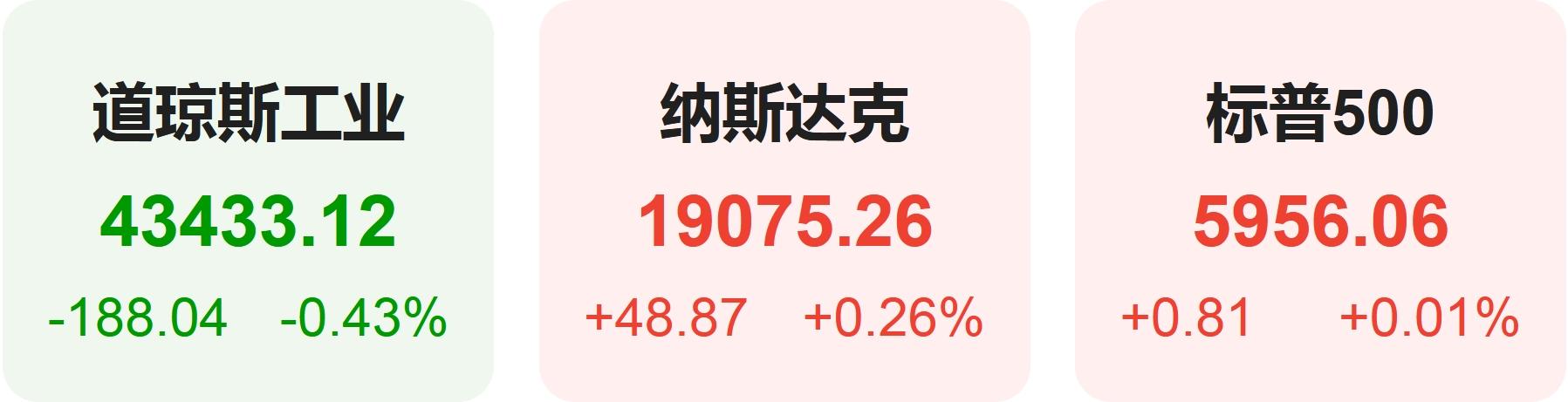截至周三收盘,标准普尔500指数涨0.01%,报5956.06点;纳斯达克综合指数涨0.26%,报19075.26点;道琼斯工业平均指数跌0.43%,报43433.12点。
