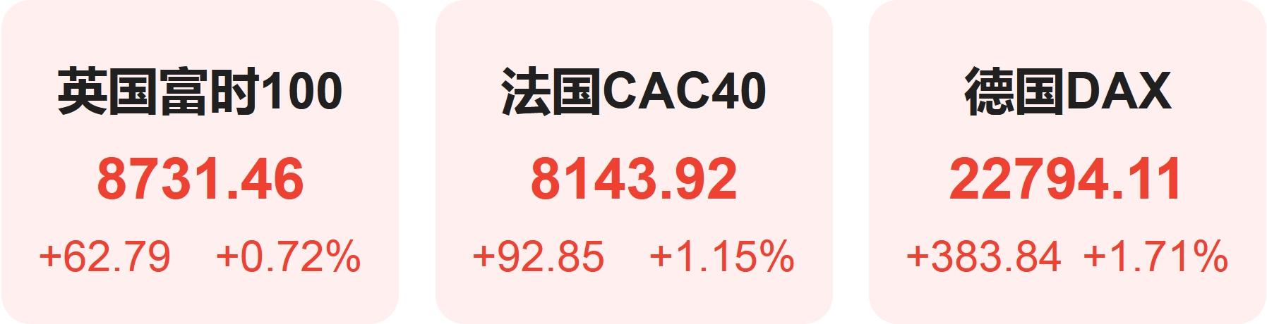 欧洲股市方面,英国富时100指数小幅上涨0.72%,报8731点。法国CAC40指数上涨1.15%,报8144点。德国DAX指数上涨1.71%,报22794点。