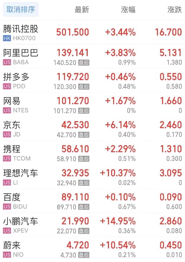 热门中概股方面,腾讯控股(港股)涨3.44%,阿里巴巴涨3.81%,拼多多涨0.50%,网易涨1.67%,携程涨2.29%,理想汽车涨10.31%,百度涨0.16%,小鹏汽车涨14.95%,蔚来涨10.54%。