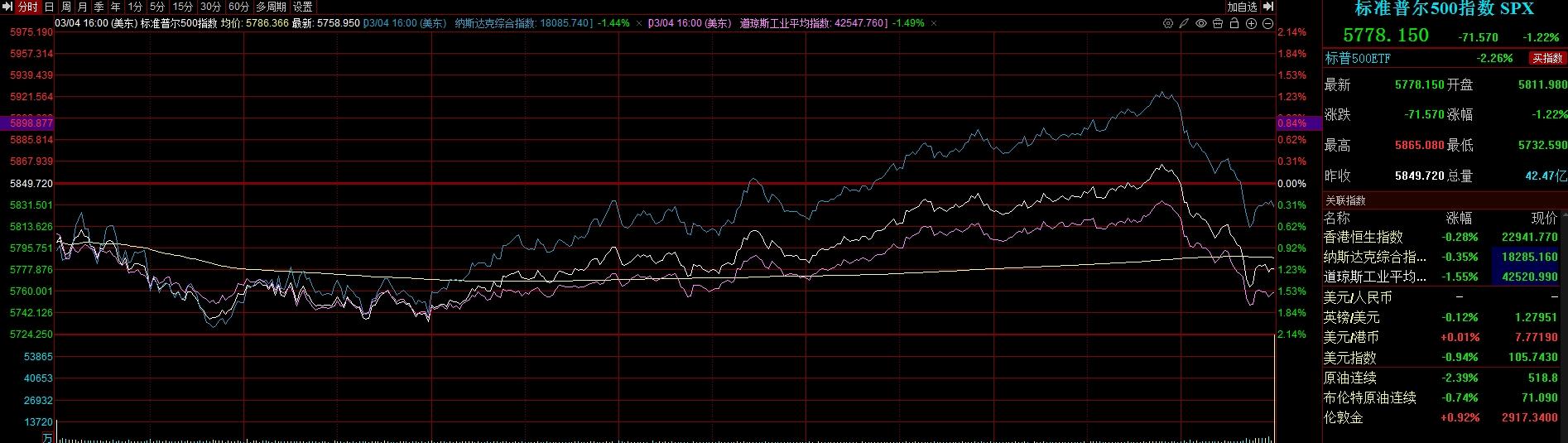 美东时间周二(3月4日),特朗普关税政策落地,中、加、墨开启反制,贸易紧张局势升级,风险资产惨遭抛售,美股再跌,标普500抹平美国大选以来的涨幅,欧股全线大跌,泛欧股指收跌超2%,德股跌超800点。但随后,美国商务部长表示美国可能降低关税。纳斯达克中国金龙指数逆势涨近2%。