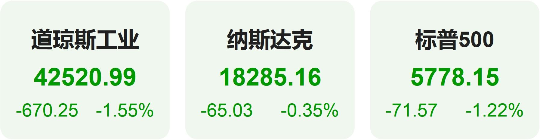 截至收盘,道指跌670.25点,跌幅为1.55%,报42520.99点;纳指跌65.03点,跌幅为0.35%,报18285.16点;标普500指数跌71.57点,跌幅为1.22%,报5778.15点。