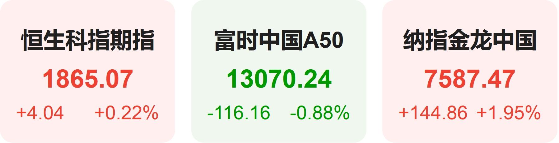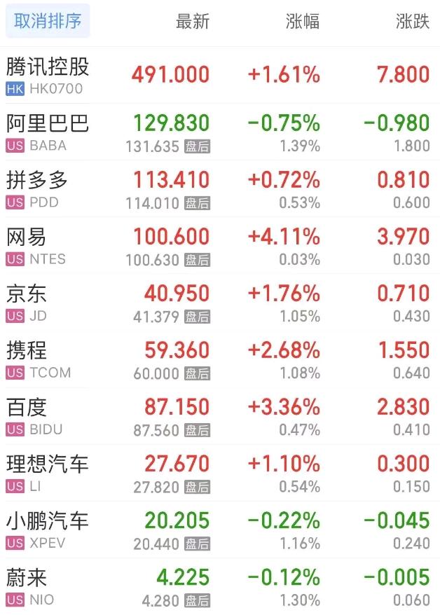热门中概股方面,腾讯控股(港股)涨1.61%,阿里巴巴跌0.75%,拼多多涨0.72%,网易涨4.11%,携程涨2.68%,百度涨3.36%,理想汽车涨1.10%,小鹏汽车跌0.22%,蔚来跌0.12%。