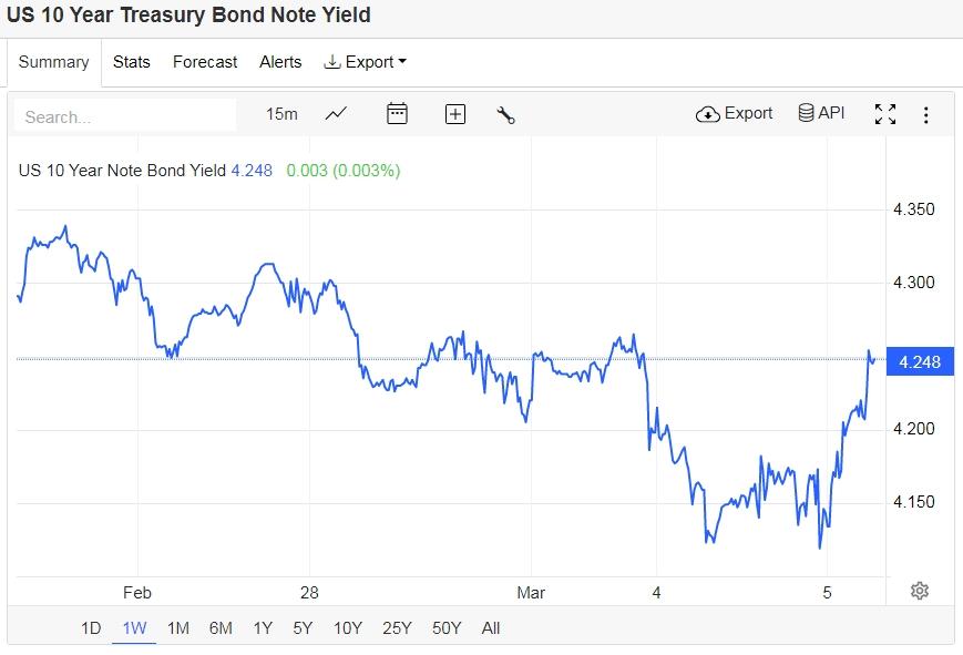 美债收益率大幅反弹,基准的10年期美债收益率收报4.248%;对货币政策更敏感的两年期美债收益率收报4.005%。