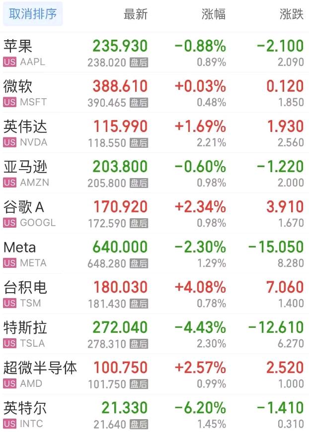 热门美股中,苹果跌0.88%,微软涨0.03%,英伟达涨1.69%,亚马逊跌0.60%,谷歌C涨2.34%,谷歌A涨2.34%,Meta跌2.30%,台积电涨4.08%,特斯拉跌4.43%,超微半导体涨2.57%。