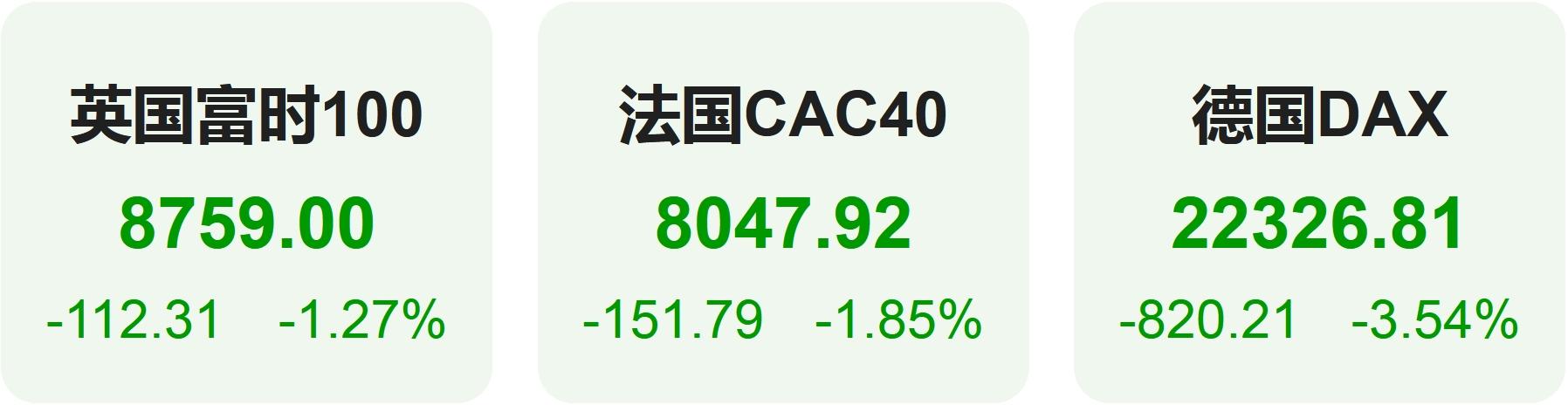 欧洲股市方面,英国富时100指数下跌1.27%,报8759点。法国CAC40指数下跌1.85%,报8048点。德国DAX指数大跌3.54%,报22327点。