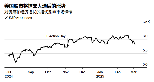 特朗普重返白宫时,华尔街曾因预期政府将刺激经济而欢欣鼓舞。即使这种热情在2025年初有所减弱,股市仍处于或接近历史高点。标普500指数在2月19日创下新高,自选举日以来上涨了6.3%,约合3.4万亿美元。两周后,这些涨幅消失殆尽。该指数与四个月前美国人前往投票站时几乎持平。