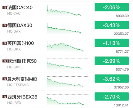 全球股市普遍暴跌,法国股市跌超2%,德国股市跌超3%。