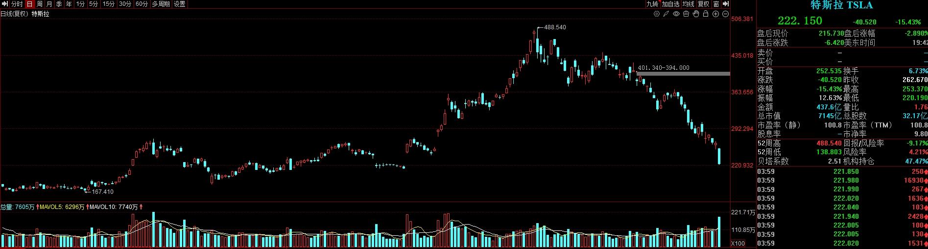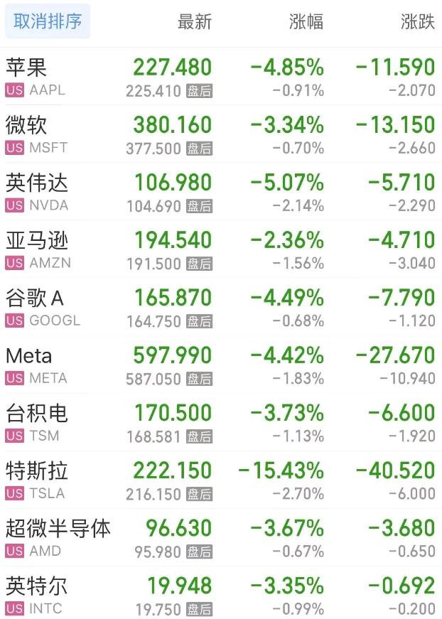 热门美股中,苹果跌4.85%,微软跌3.34%,英伟达跌5.07%,亚马逊跌2.36%,谷歌C跌4.41%,谷歌A跌4.49%,Meta跌4.42%,台积电跌3.73%,特斯拉跌15.43%,超微半导体跌3.67%。