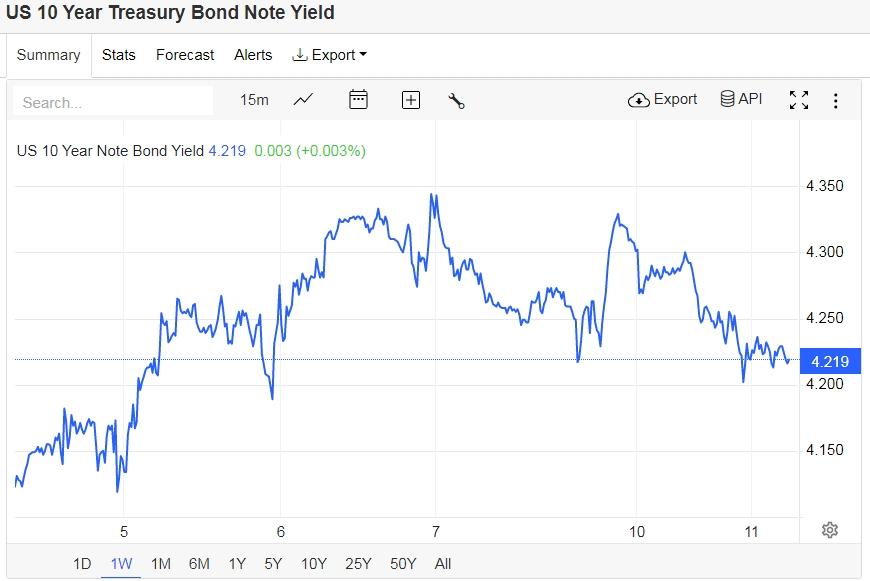 美债收益率集体大跌,基准的10年期美债收益率收报4.216%;对货币政策更敏感的两年期美债收益率收报4.894%。