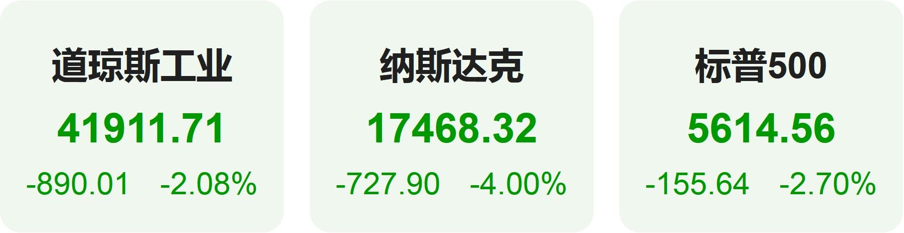 截至收盘,道琼斯指数跌2.08%,报41,911.71点;标普500指数跌2.70%,报5,614.56点,较2月19日历史高点已回落8.7%;纳斯达克指数跌4.00%,报17,468.32点,较近期高点下跌近14%,跌入回调区间。