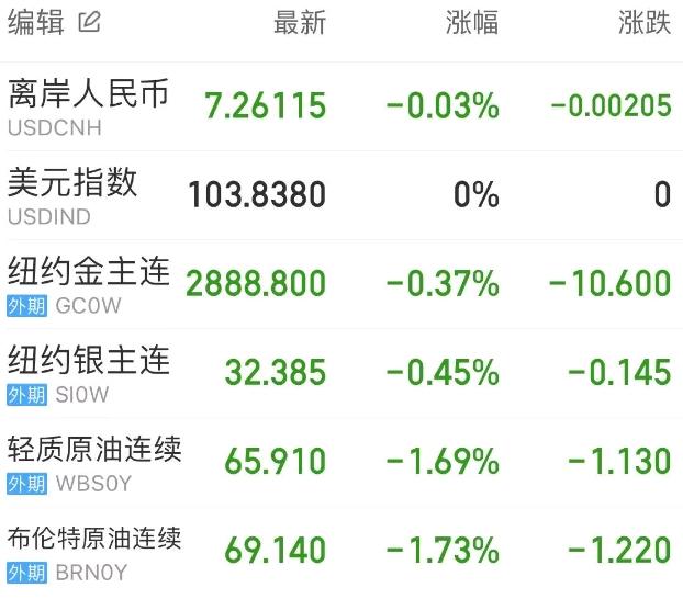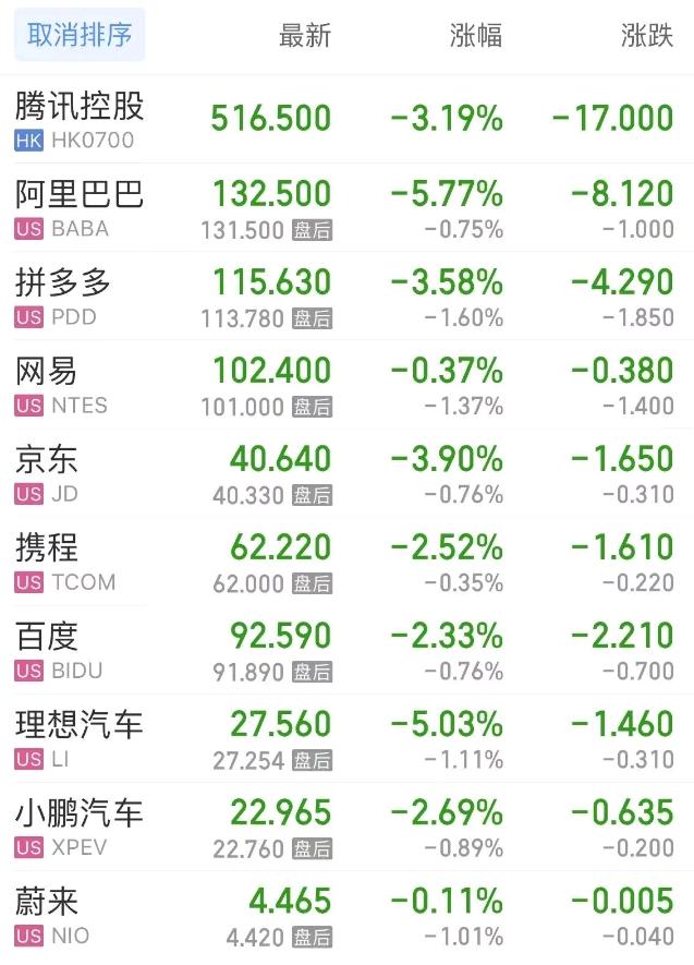 热门中概股方面,腾讯控股(港股)跌3.19%,阿里巴巴跌5.77%,拼多多跌3.58%,网易跌0.37%,携程跌2.52%,百度跌2.33%,理想汽车跌5.03%,小鹏汽车跌2.69%,蔚来跌0.11%。
