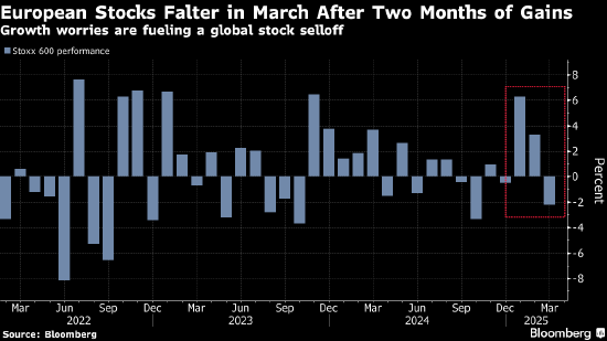 继年初强劲上涨后,欧洲基准股指出现下跌,因为围绕美国经济增长放缓的担忧抑制了对该地区财政和政治前景改善的乐观情绪。斯托克600指数较3月3日的纪录高点下跌了4.4%,不过这一跌幅仅为标普500指数自2月见顶以来跌幅的一半左右。