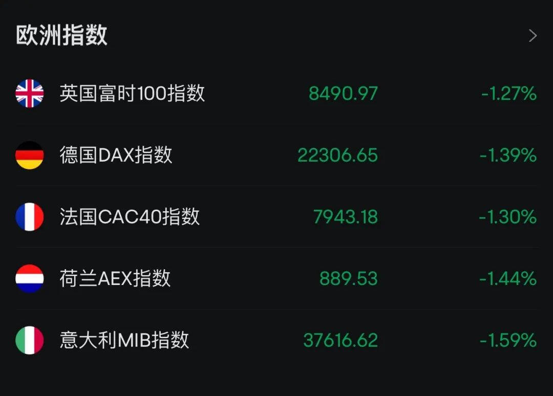 欧洲股市尾盘跌势也扩大。英国富时100指数、德国DAX指数、法国CAC40指数、欧洲斯托克50指数等欧洲主要指数,均跌超1%。