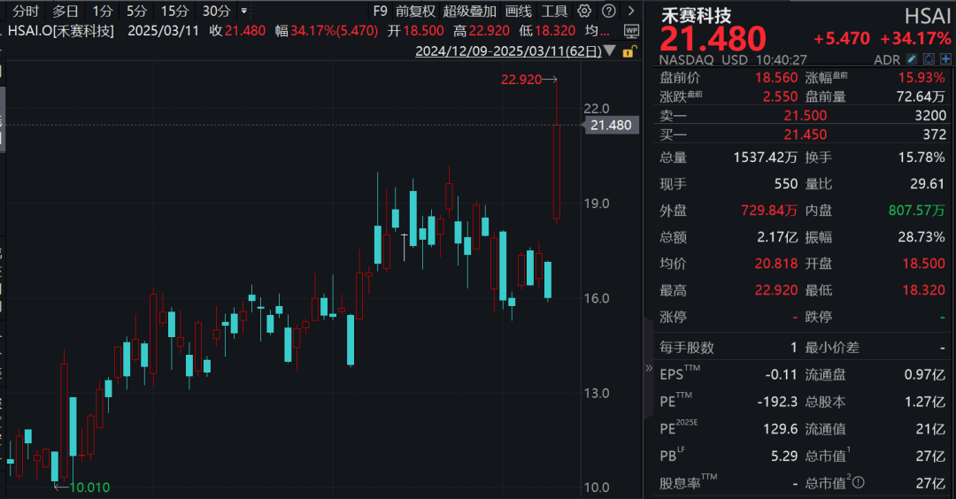 激光雷达企业禾赛科技在美股飙涨超34%,报道称公司向梅赛德斯供应激光雷达传感器。