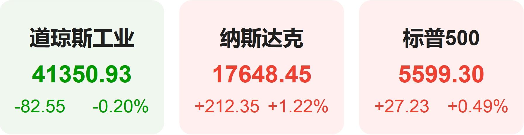 截至收盘,道琼斯指数跌0.20%,报41,350.93点,盘中一度抹平超400点跌幅转涨;标普500指数涨0.49%,报5,599.30点;纳斯达克指数涨1.22%,报17,648.45点。