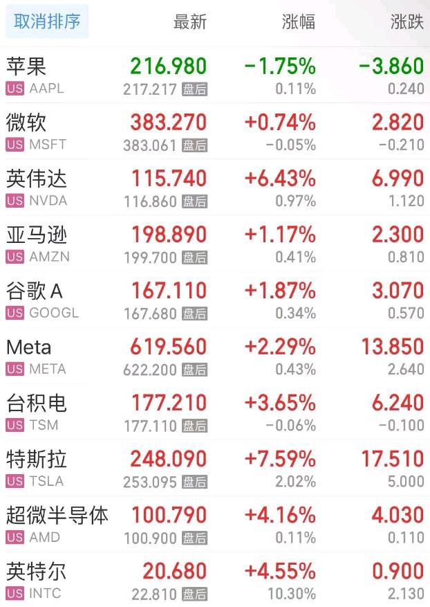 热门美股中,苹果跌1.75%,微软涨0.74%,英伟达涨6.43%,亚马逊涨1.17%,谷歌C涨1.82%,谷歌A涨1.87%,Meta涨2.29%,台积电涨3.65%,特斯拉涨7.59%,超微半导体涨4.17%。