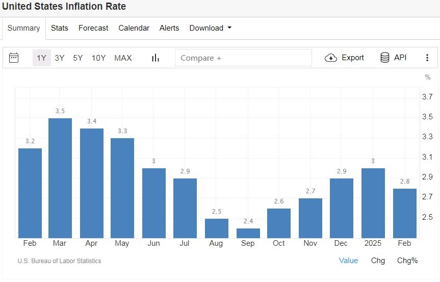 周三美国劳工统计局公布数据显示,美国2月CPI同比增长2.8%,创去年11月以来新低,预估为2.9%,前值为3%;2月CPI环比增长0.2%,预估为0.3%,前值为0.5%。美国2月核心CPI同比增长3.1%,为2021年4月来新低;预估为3.2%,前值为3.3%;美国2月核心CPI环比增长0.2%,预估为0.3%,前值为0.4%。不过这种改善可能只是暂时的,因为特朗普政府肆意加征关税预计将在未来几个月持续推高多数商品的价格。