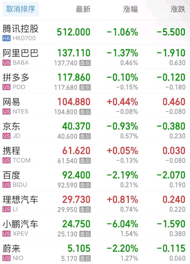 热门中概股方面,腾讯控股(港股)跌1.06%,阿里巴巴跌1.37%,拼多多跌0.10%,网易涨0.44%,携程涨0.05%,百度跌2.19%,理想汽车涨0.81%,小鹏汽车跌6.04%,蔚来跌2.20%。