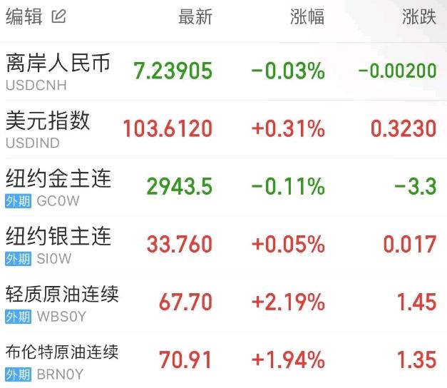 由于美国政府数据显示石油和天然气库存比预期更紧张,国际油价延续反弹。WTI原油收涨2.19%,报67.7美元/桶;布伦特原油收复70关口,最终收涨1.94%,报70.91美元/桶。