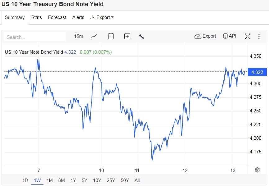 美债收益率在CPI数据公布后短线下挫,随后迅速拉升,基准的10年期美债收益率收报4.322%;对货币政策更敏感的两年期美债收益率盘中触及4%关口,最终收报3.991%。