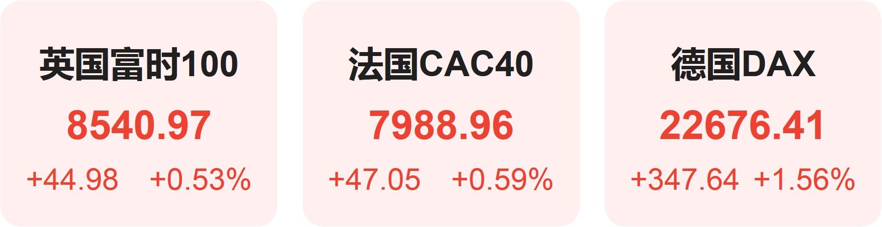 欧洲股市方面,英国富时100指数小幅上涨0.53%,报8541点。法国CAC40指数小幅上涨0.59%,报7989点。德国DAX指数上涨1.56%,报22676点。