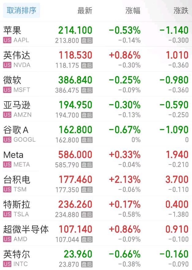 热门美股中,苹果跌0.53%,英伟达涨0.86%,微软跌0.25%,亚马逊跌0.30%,谷歌C跌0.74%,谷歌A跌0.67%,Meta涨0.33%,台积电涨2.13%,特斯拉涨0.17%,超微半导体涨0.86%,英特尔跌0.66%。