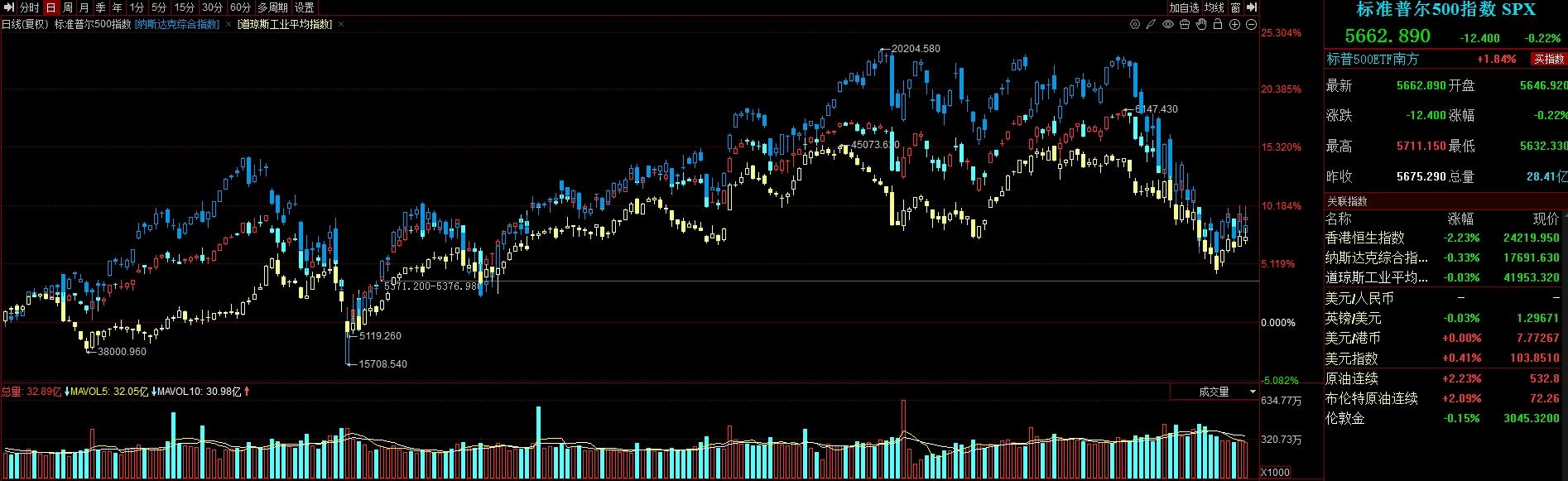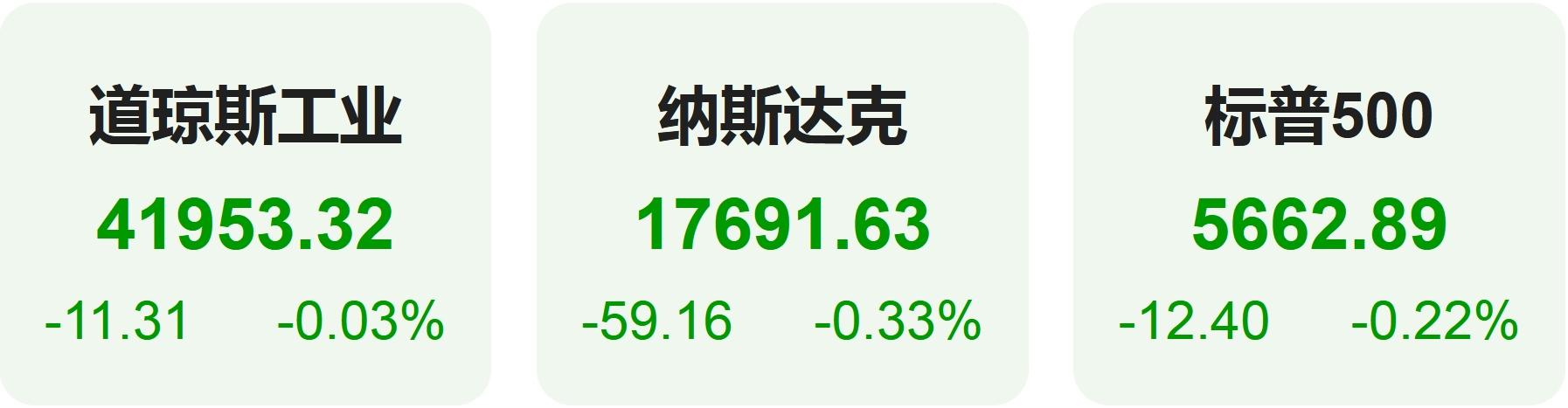 截至收盘,道琼斯指数跌0.03%,报41,953.32点;标普500指数跌0.22%,报5,662.89点;纳斯达克综合指数跌0.33%,报17,691.63点。