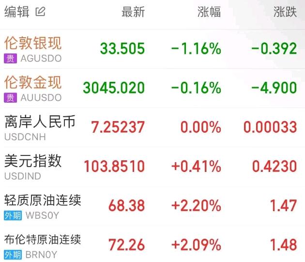 现货黄金在盘中早些时候创下历史新高后回落,伦敦金最终收跌0.17%,报3044.42美元/盎司。现货白银连续第二日下跌,伦敦银最终收跌1.13%,报33.514美元/盎司。