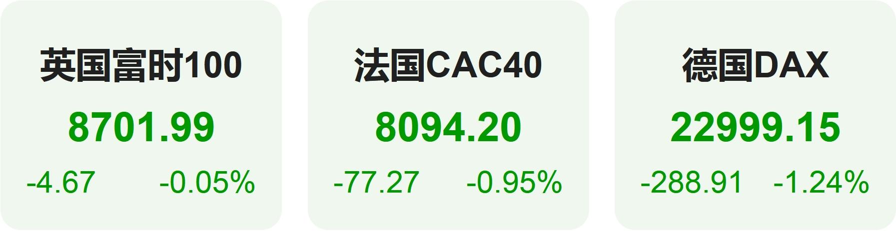 欧洲股市方面,英国富时100指数小幅下跌0.05%,报8702点。法国CAC40指数小幅下跌0.95%,报8094点。德国DAX指数下跌1.24%,报22999点。