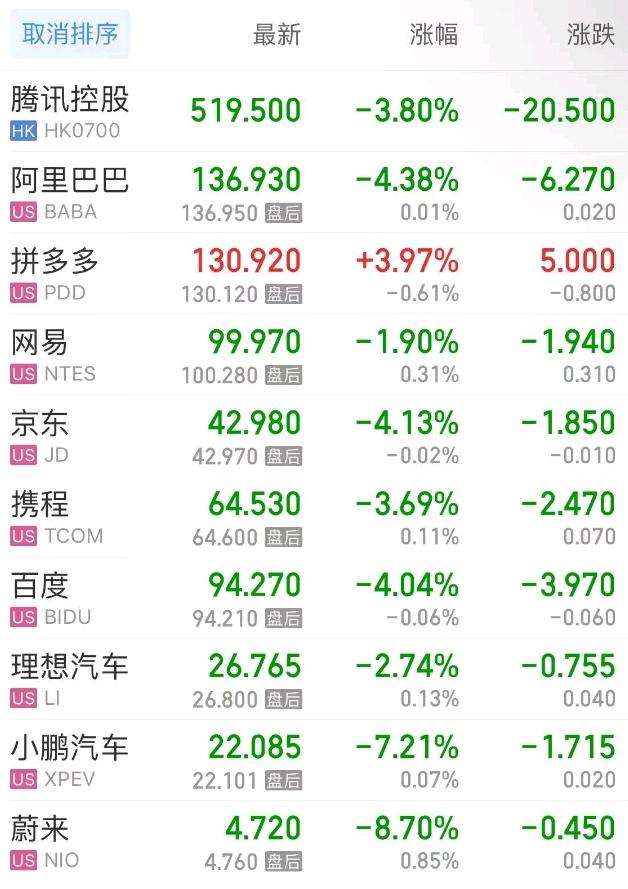 热门中概股方面,腾讯控股(港股)跌3.80%,阿里巴巴跌4.38%,拼多多涨3.97%,网易跌1.90%,携程跌3.69%,百度跌4.04%,理想汽车跌2.74%,小鹏汽车跌7.21%,蔚来跌8.70%。
