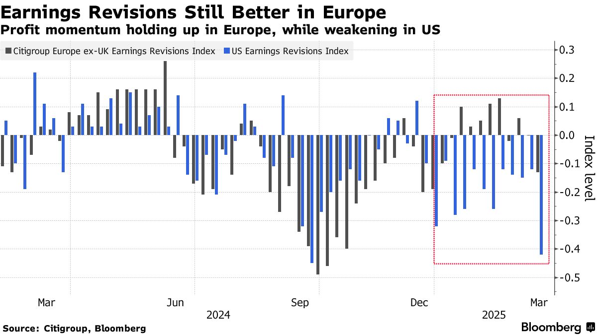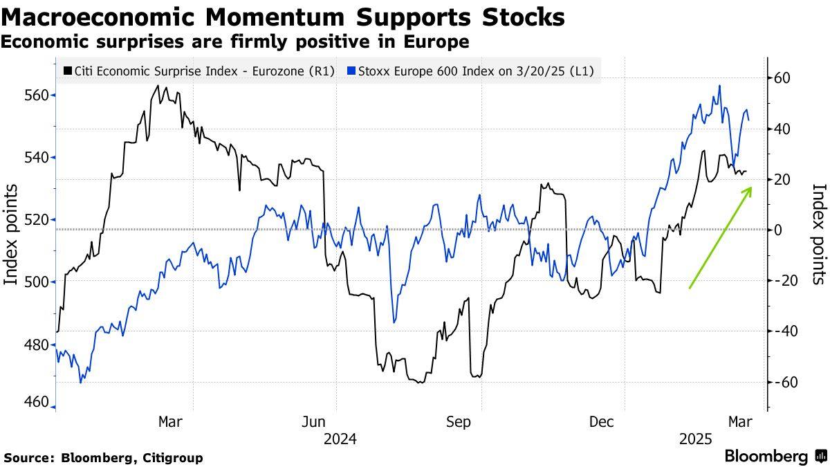 欧洲股市的上涨受益于吸引投资者的几个因素。德国议会本周投票通过了一项具有里程碑意义的支出计划,为德国国防和基础设施提供数千亿欧元资金,意味着数十年来的“债务刹车”实现了放松。欧盟随后可能会出台进一步的财政刺激措施。