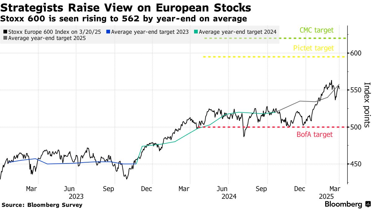 欧洲的经济势头似乎依然强劲,尤其是与美国相比。因此,欧洲股市没有与美国股市一样遭遇大幅回调,策略师们如今上调对欧洲股市的目标可能会助长投资者的乐观情绪。