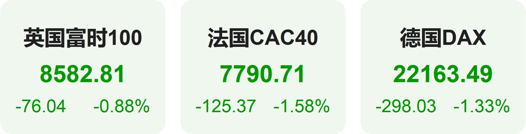 欧洲股市方面,英国富时100指数小幅下跌0.88%,报8583点。法国CAC40指数下跌1.58%,报7791点。德国DAX指数下跌1.33%,报22163点。