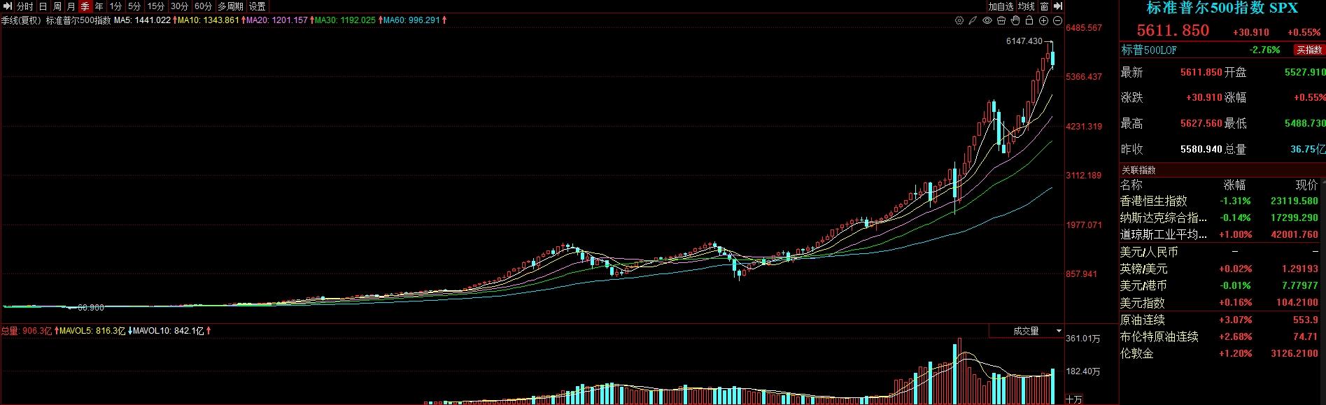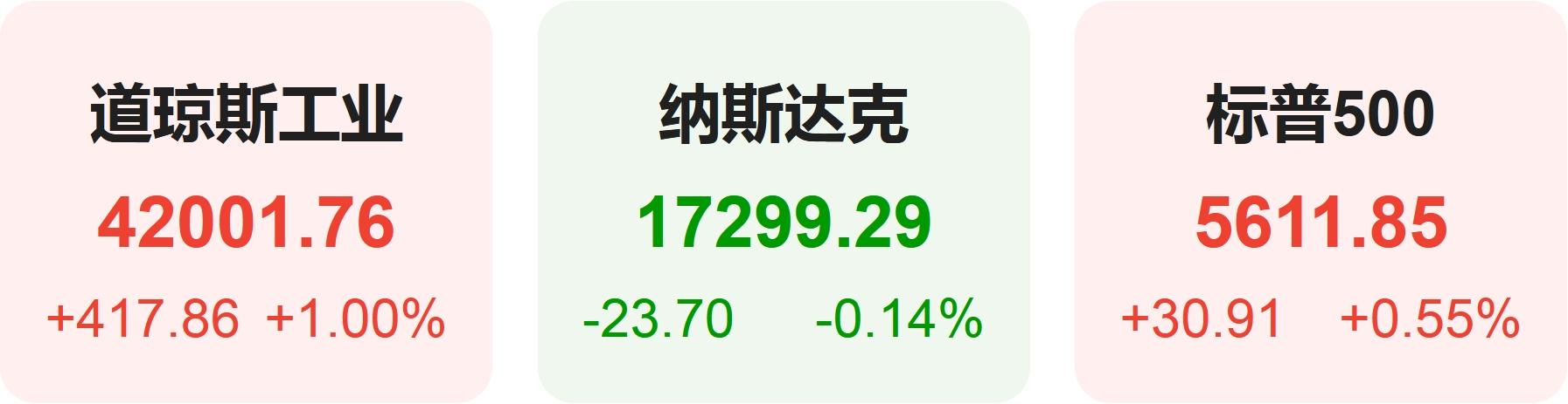 截至收盘,道指涨417.86点,涨幅为1.00%,报42001.76点;纳指跌23.70点,跌幅为0.14%,报17299.29点;标普500指数涨30.91点,涨幅为0.55%,报5611.85点。