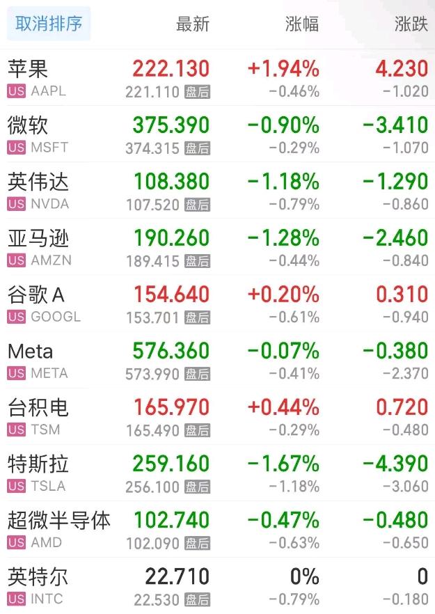 热门美股中,苹果涨1.94%,微软跌0.90%,英伟达跌1.18%,亚马逊跌1.28%,谷歌C涨0.11%,谷歌A涨0.20%,Meta跌0.07%,台积电涨0.44%,特斯拉跌1.67%,超微半导体跌0.47%。