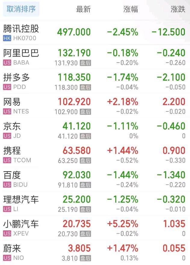 热门中概股方面,腾讯控股(港股)跌2.45%,阿里巴巴跌0.18%,拼多多跌1.74%,网易涨2.18%,携程涨1.44%,百度跌1.44%,理想汽车跌1.25%,小鹏汽车涨5.25%,蔚来涨1.47%。