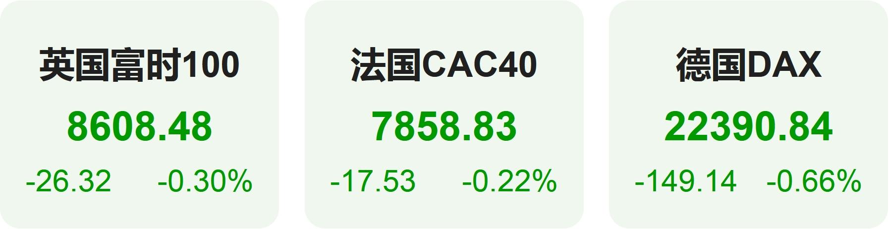 欧洲股市方面,英国富时100指数小幅下跌0.30%,报8608点。法国CAC40指数小幅下跌0.22%,报7859点。德国DAX指数小幅下跌0.66%,报22391点。