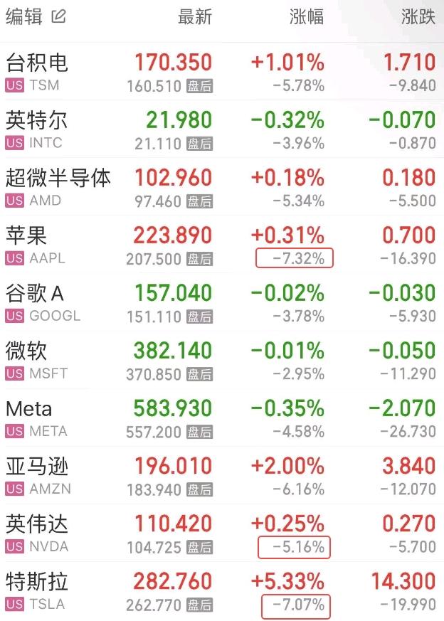 盘后科技巨头集体暴跌,截至发稿,苹果、特斯拉双双跌超7%,英伟达跌超5%,Meta跌超4%。