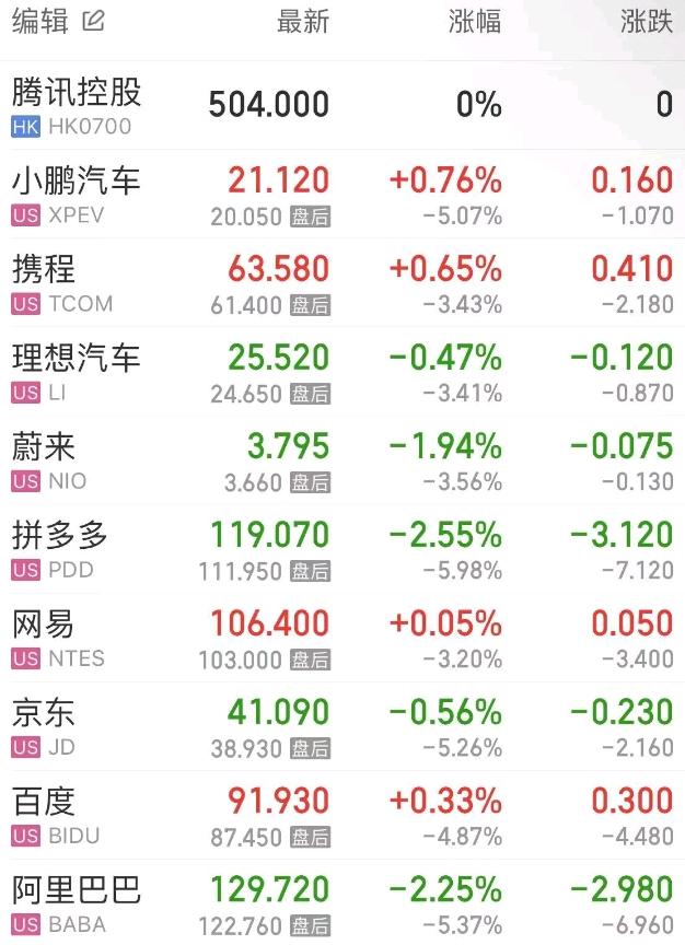 热门中概股方面,腾讯控股(港股)涨0.00%,阿里巴巴跌2.25%,拼多多跌2.55%,网易涨0.05%,携程涨0.65%,百度涨0.33%,理想汽车跌0.47%,小鹏汽车涨0.76%,蔚来跌1.94%。