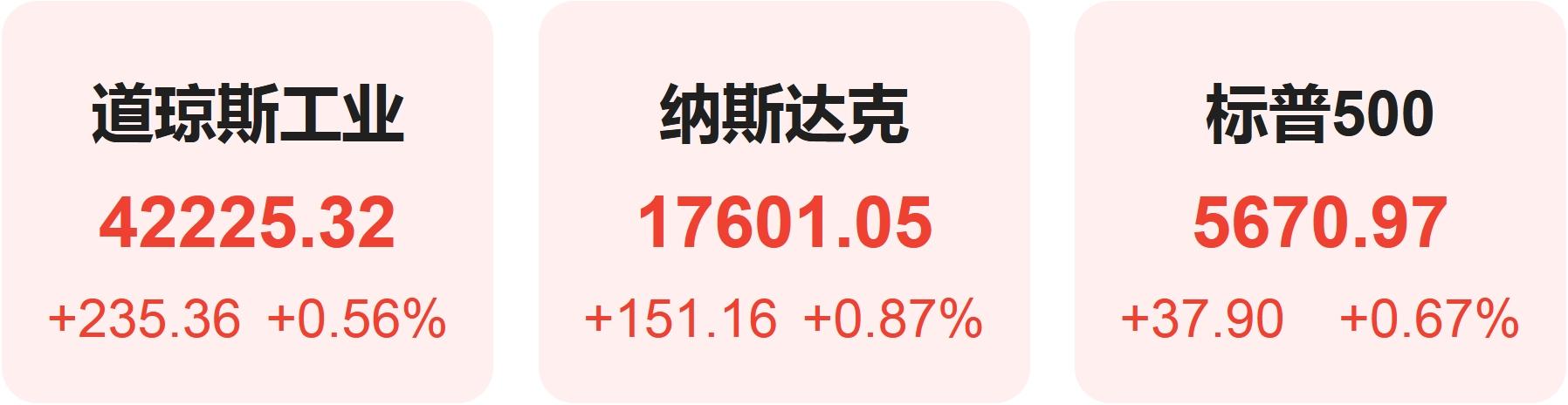 截至收盘,道指涨235.36点,涨幅为0.56%,报42225.32点;纳指涨151.16点,涨幅为0.87%,报17601.05点;标普500指数涨37.90点,涨幅为0.67%,报5670.97点。