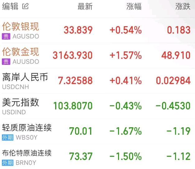 黄金继续发挥避险属性,伦敦金收涨1.45%,报3160美元/盎司,再创新高。伦敦银最终收涨0.6%,报33.859美元/盎司。