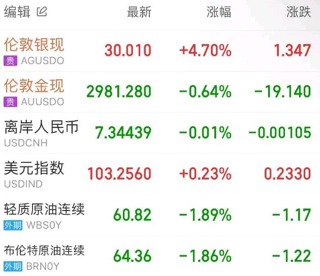 现货黄金日内大震,盘中振幅高达近100美元,其在亚盘一度回升至3050美元关口上方,随后迅速回落,并失守3000美元大关,伦敦金最终收跌1.81%,报2980美元/盎司。现货白银则小幅回升,伦敦银收涨1.31%,报29.96美元/盎司。