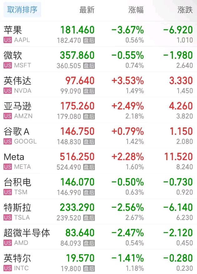 热门美股中,苹果跌3.67%,微软跌0.55%,英伟达涨3.53%,亚马逊涨2.49%,谷歌C涨1.02%,谷歌A涨0.79%,Meta涨2.28%,台积电跌0.50%,特斯拉跌2.56%,超微半导体跌2.47%。