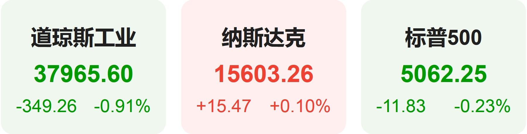 截至收盘,道琼斯指数跌0.91%,报37,965.60点;标普500指数跌0.23%,报5,062.25点,均录得三连跌;纳斯达克综合指数涨0.1%,报15,603.26点,终结连续两日的暴跌。