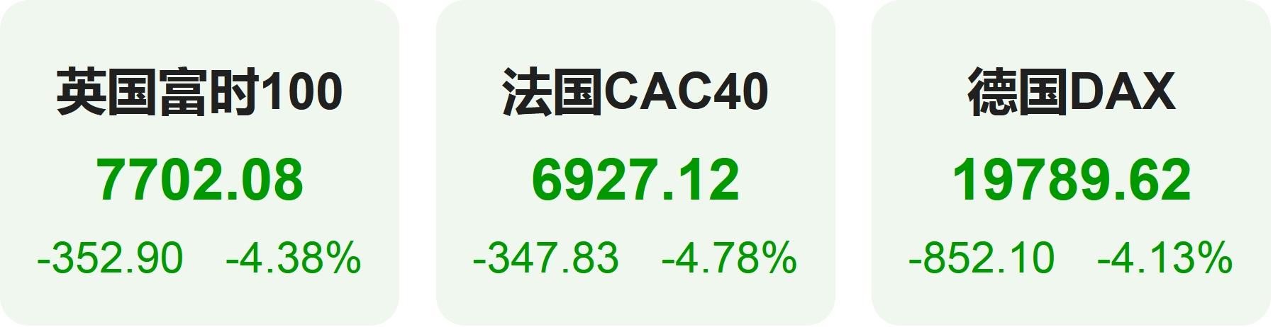 欧洲股市方面,英国富时100指数暴跌4.38%,报7702点。法国CAC40指数暴跌4.78%,报6927点。德国DAX指数暴跌4.26%,报19762点。