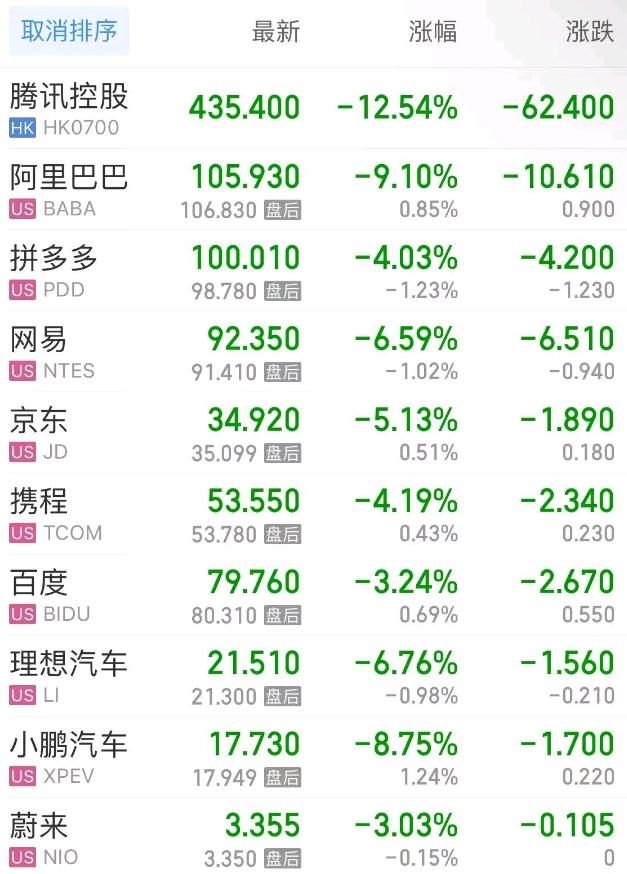 热门中概股方面,腾讯控股(港股)跌12.54%,阿里巴巴跌9.10%,拼多多跌4.03%,网易跌6.59%,携程跌4.19%,百度跌3.24%,理想汽车跌6.76%,小鹏汽车跌8.75%,蔚来跌3.04%。