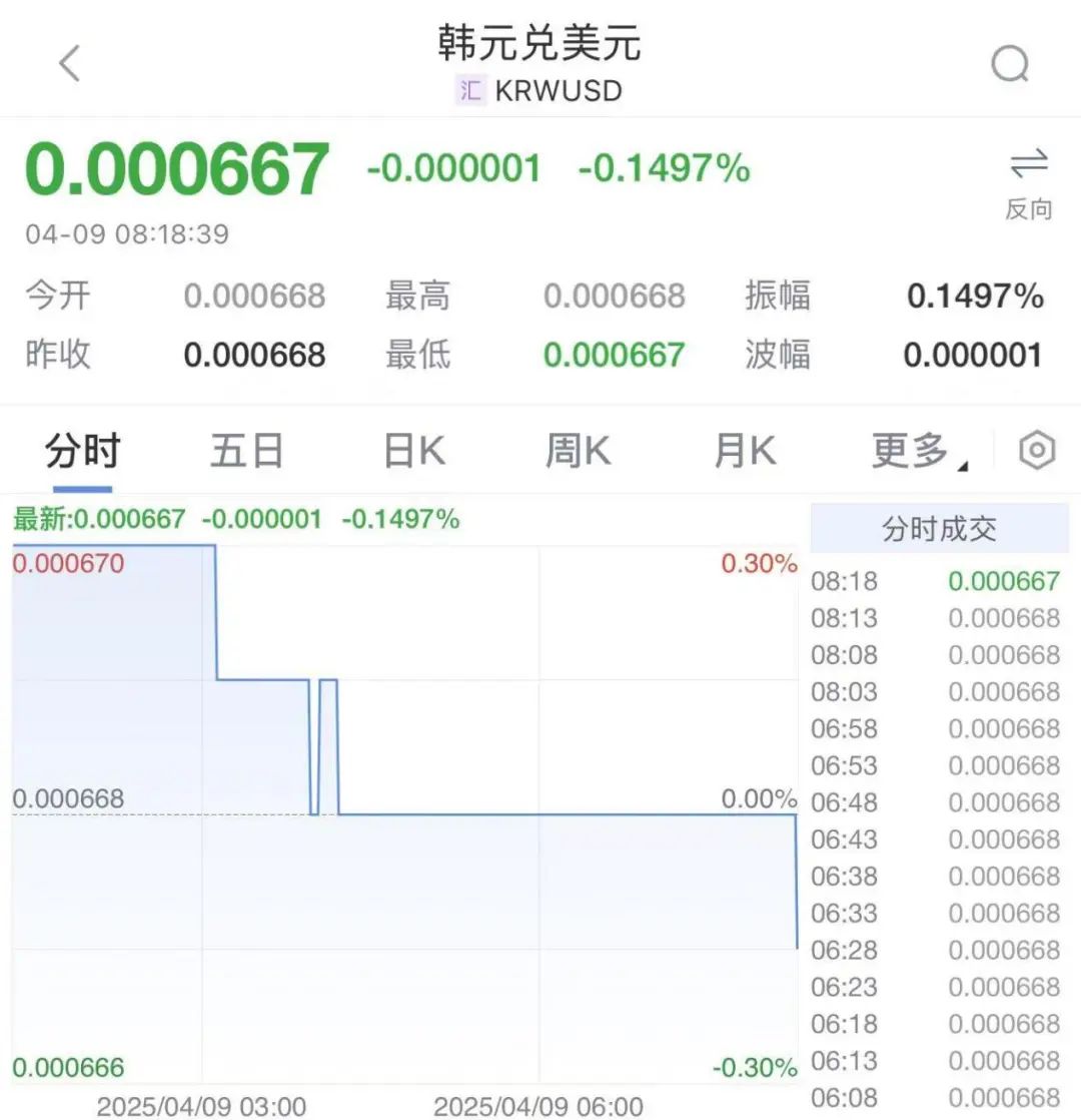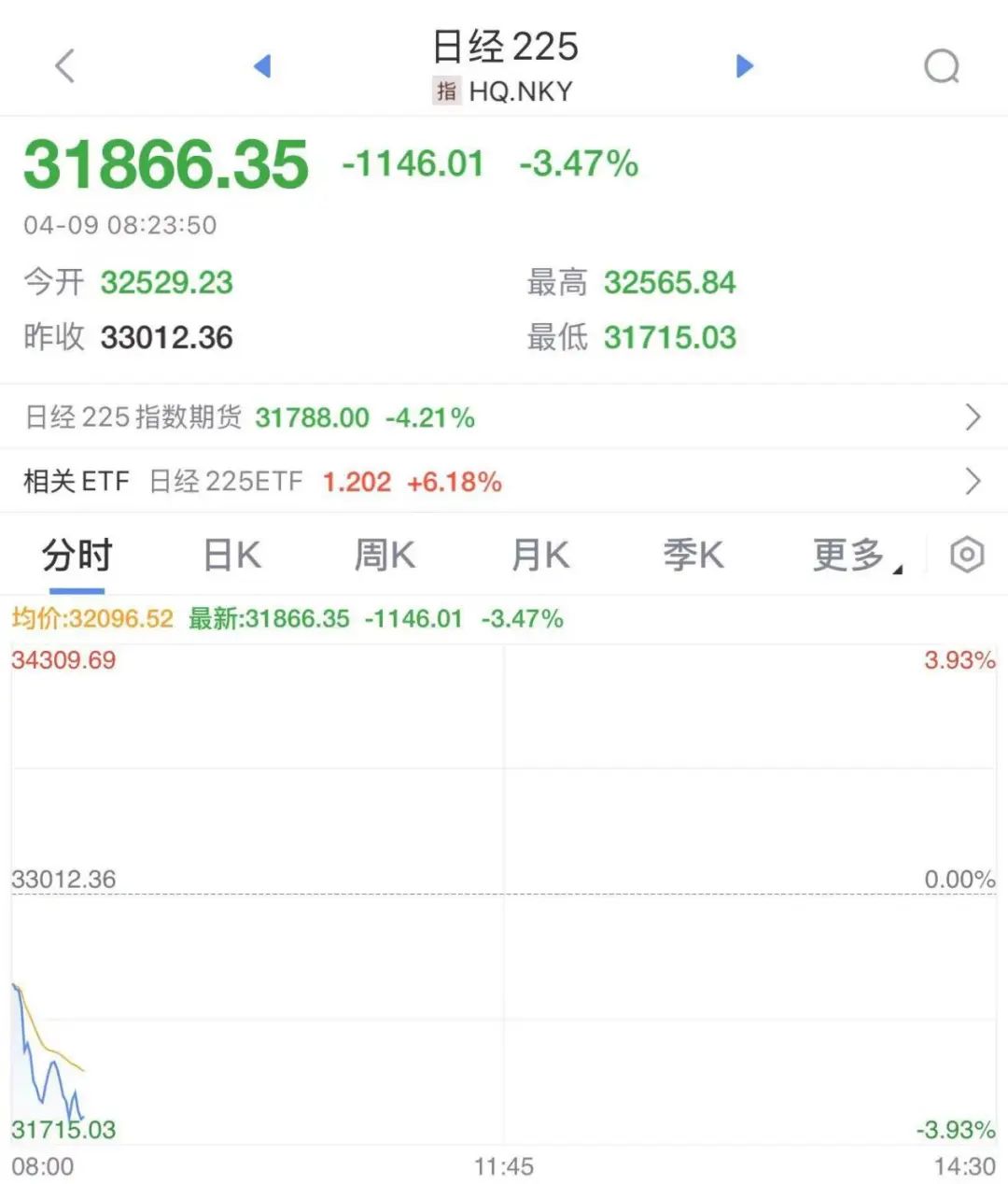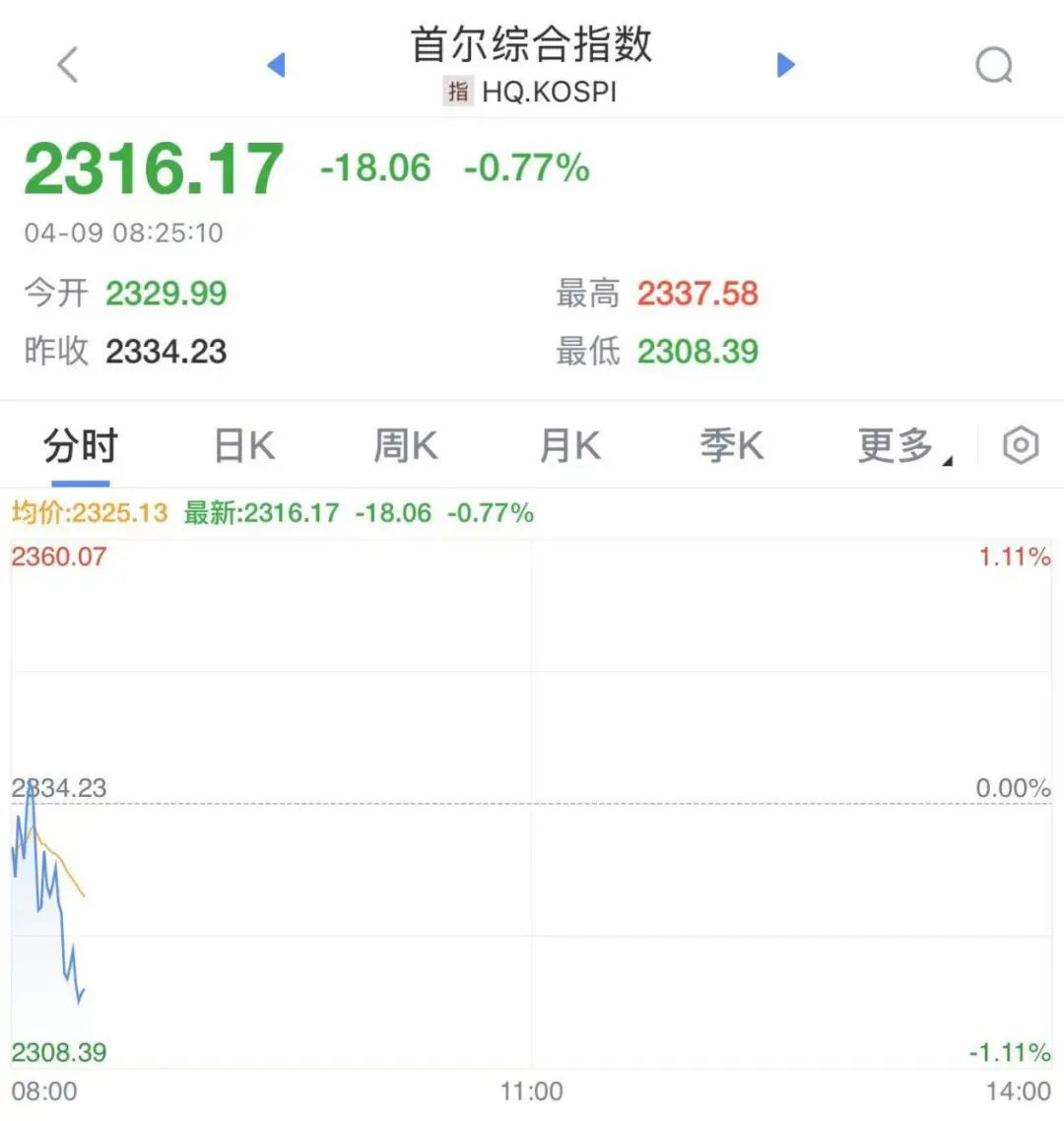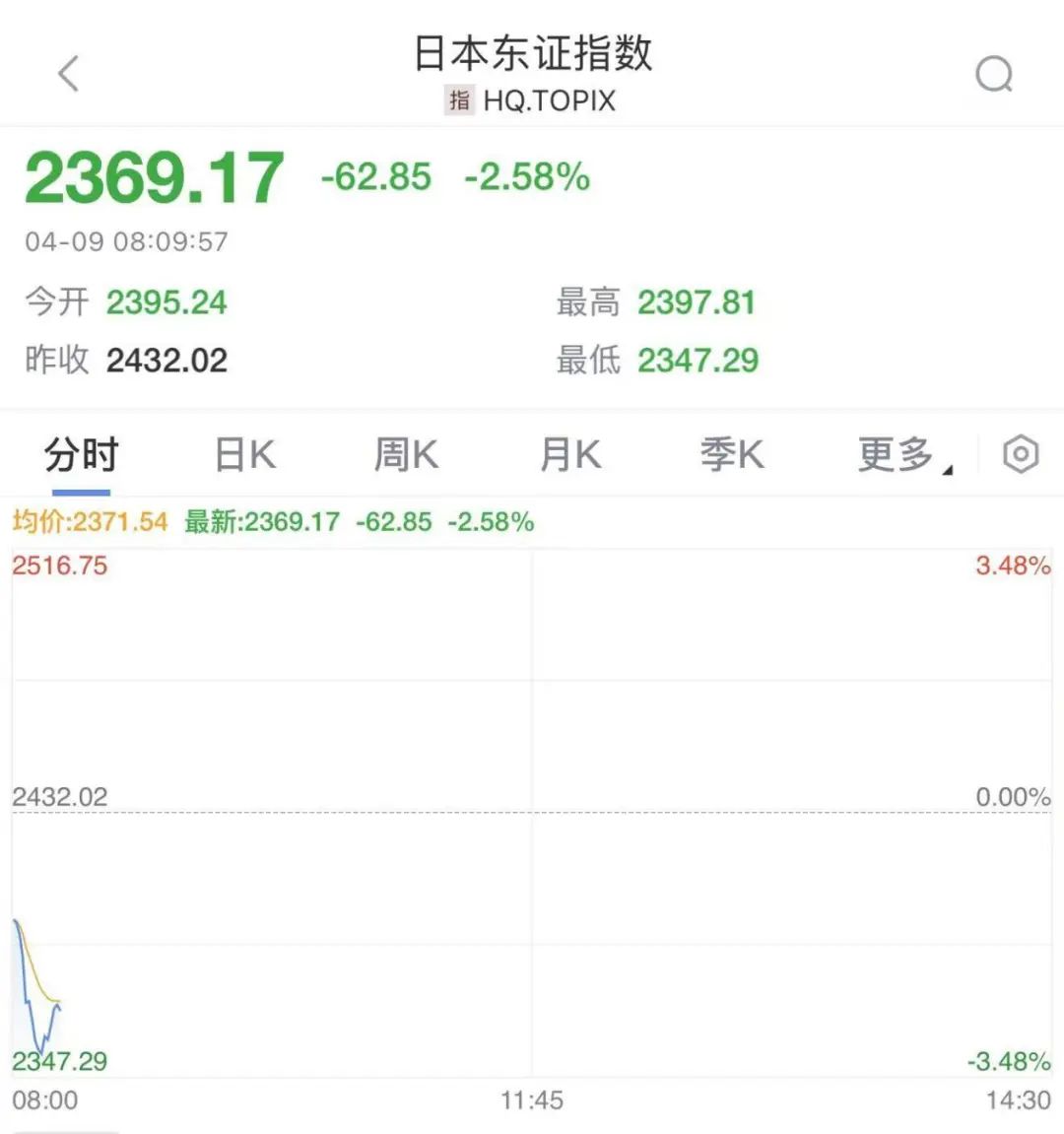 4月9日,日韩股市重现跌势,日经225指数跌幅扩大,现跌超3%,日本东证指数盘中同样跌超3%。
